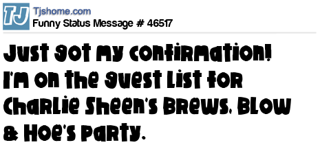 X is Just got my confirmation! I'm on the guest list for Charlie Sheen's Brews, Blow & Hoe's party.