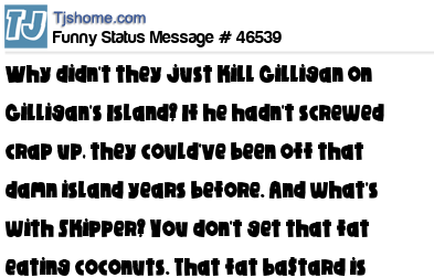 - # 46538 Why didn't they just kill Gilligan on Gilligan's Island? If he hadn't screwed crap up, they could've been off that damn island years before. And what's with Skipper? You don't get that fat eating coconuts. That fat bastard is hiding something.