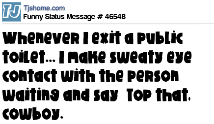 - # 29511 Whenever I exit a public toilet, I make sweaty eye contact with the person waiting & say "Top that, cowboy."