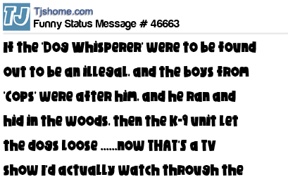 X If the 'Dog Whisperer' were to be found out to be an illegal, and the boys from 'Cops' were after him, and he ran and hid in the woods, then the K-9 unit let the dogs loose ......now THAT'S a TV show I'd actually watch through the commercial breaks.....