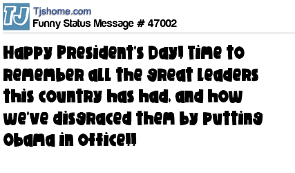 X says Happy President's Day! Time to remember all the great leaders this country has had, and how we've disgraced them by putting Obama in office!!