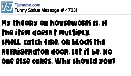 X says My theory on housework is, if the item doesn't multiply, smell, catch fire, or block the refrigerator door, let it be. No one else cares. Why should you?