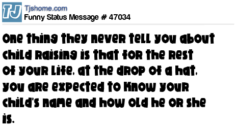 X says One thing they never tell you about child raising is that for the rest of your life, at the drop of a hat, you are expected to know your child's name and how old he or she is.