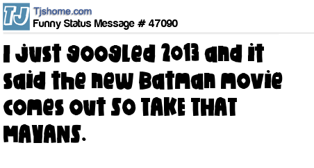 X says I just googled 2013 and it said the new Batman movie comes out SO TAKE THAT MAYANS.