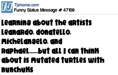 X is learning about the artists leanardo, donatello, michelangelo, and raphael......but all I can think about is mutated turtles with nunchuks