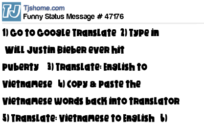 X says 1) Go to Google Translate 2) Type in “Will Justin Bieber ever hit puberty” 3) Translate: English to Vietnamese 4) Copy & paste the Vietnamese words back into translator 5) Translate: Vietnamese to English 6) Laugh Uncontrollably!!