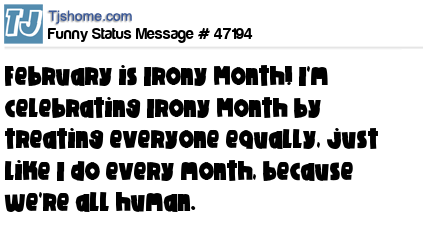 X February is Irony Month! I'm celebrating Irony Month by treating everyone equally, just like I do every month, because we're all human.