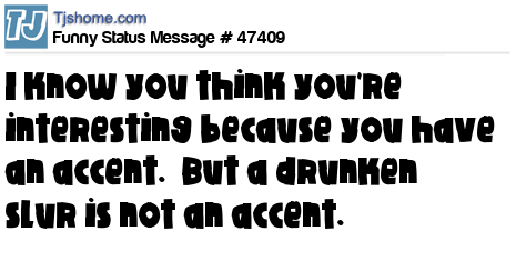 X I know you think you're interesting because you have an accent. But a drunken slur is not an accent.