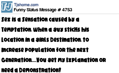- # 52414 Sex is a sensation caused by a temptation, a guy sticks his location in a girl's destination to increase the population of the next generation, do you get my explanation or do you need a demonstration?