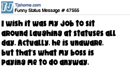 X I wish it was my job to sit around laughing at statuses all day. Actually, he is unaware, but that's what my boss is paying me to do anyway.