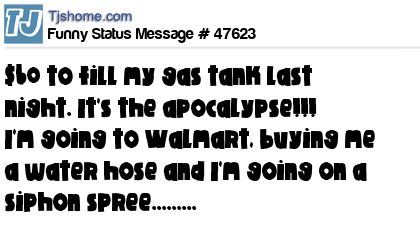 X $60 to fill my gas tank last night. It's the apocalypse!!! I'm going to Walmart, buying me a water hose and I'm going on a siphon spree.........