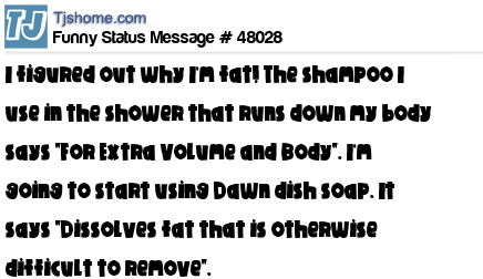 - # 49520 I figured out why I'm so fat! The shampoo I use in the shower that runs down my body says "for extra volume and body". I'm going to start using Dawn dish washing soap. It says "dissolves fat that is otherwise difficult to remove".