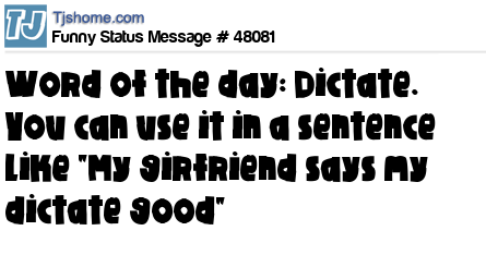 X word of the day: Dictate. You can use it in a sentence like "My girfriend says my dictate good"