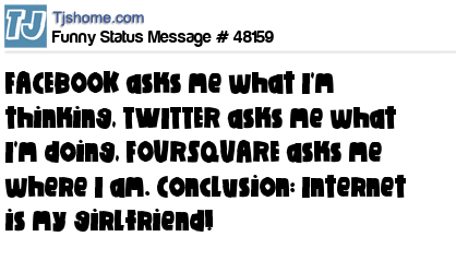 X FACEBOOK asks me what I'm thinking, TWITTER asks me what I'm doing, FOURSQUARE asks me where I am. Conclusion: Internet is my girlfriend!