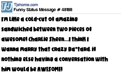 X says I'm like a cold-cut of amazing sandwiched between two pieces of awesome! Charlie Sheen....I think I wanna marry that crazy Ba*tard, if nothing else having a conversation with him would be AWESOME!