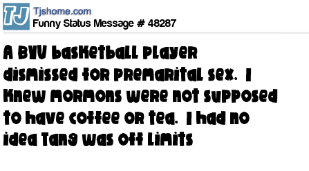 X A BYU basketball player dismissed for premarital sex. I knew mormons were not supposed to have coffee or tea. I had no idea Tang was off limits