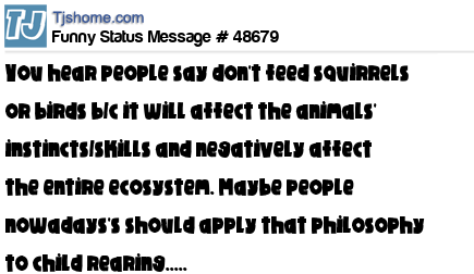 X You hear people say don't feed squirrels or birds b/c it will affect the animals' instincts/skills and negatively affect the entire ecosystem. Maybe people nowadays's should apply that philosophy to child rearing.....