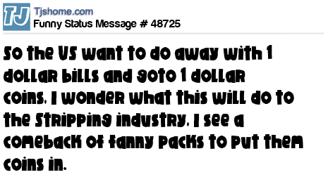 X is So the US want to do away with 1 dollar bills and goto 1 dollar coins, I wonder what this will do to the Stripping industry, I see a comeback of fanny packs to put them coins in.