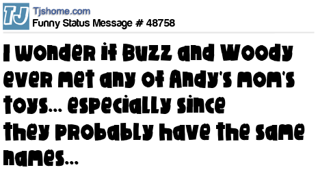 - # 158815 I wonder if Buzz and Woody ever met Andy's mom's toys.. Especially since they probably have the same names ..