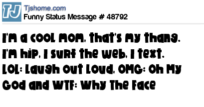 X says I'm a cool mom, that's my thang. I'm hip, I surf the web, I text. LOL: laugh out loud, OMG: Oh My God and WTF: Why The Face
