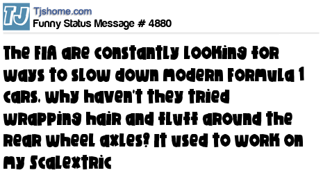 X says The FIA are constantly looking for ways to slow down modern Formula 1 cars, why haven't they tried wrapping hair and fluff around the rear wheel axles? It used to work on my Scalextric