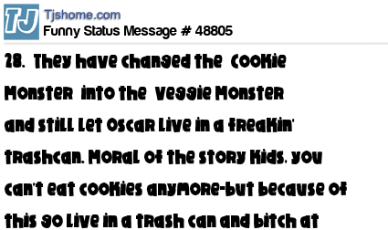 X 28. They have changed the “Cookie Monster” into the “Veggie Monster” and still let Oscar live in a freakin' trashcan. Moral of the story kids, you can't eat cookies anymore-but because of this go live in a trash can and bitch at anyone coming