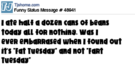 X I ate half a dozen cans of beans today all for nothing. Was I ever embarrased when I found out it's "Fat Tuesday" and not "Fart Tuesday"