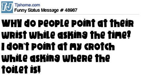 - # 76336 I hate the people who point at their wrist asking for the time... I know where my watch is pal, where the hell is yours? Do I point at my crotch when I ask where the toilet is?
