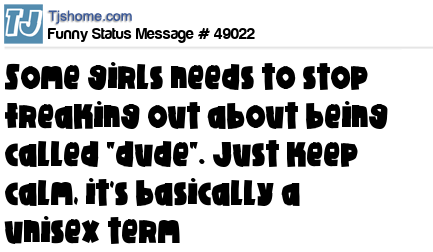 X is Some girls needs to stop freaking out about being called "dude". Just keep calm, it's basically a unisex term