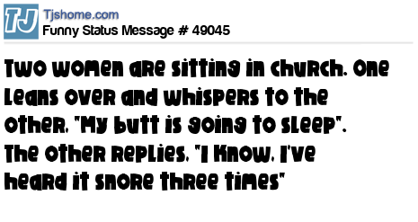 - # 35188 Joke of the day: Two old women were sitting in church. One leans over to her friend and said, "My butt is asleep." Her friend replied, "I know, I've heard it snore three times already."