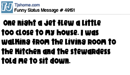 X One night a jet flew a little too close to my house. I was walking from the living room to the kitchen and the stewardess told me to sit down.