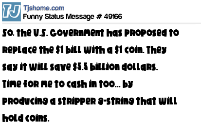 X is So, the U.S. Government has proposed to replace the $1 bill with a $1 coin. They say it will save $5.5 billion dollars. Time for me to cash in too... by producing a stripper g-string that will hold coins.