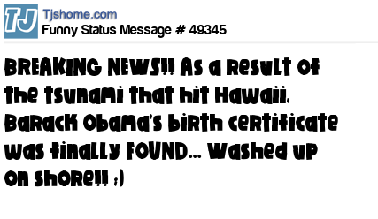 X says BREAKING NEWS!! As a result of the tsunami that hit Hawaii, Barack Obama's birth certificate was finally FOUND... Washed up on shore!! ;)