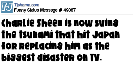 - # 49917 Apparently....Charlie Sheen is now suing the tsunami that hit Japan for replacing him as the biggest disaster on TV.