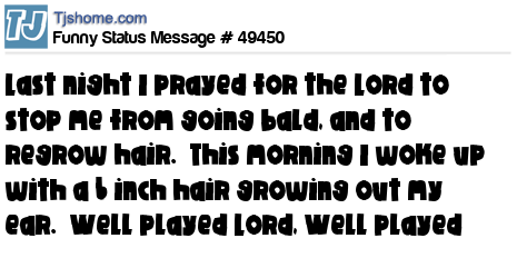 X says last night I prayed for the Lord to stop me from going bald, and to regrow hair. This morning I woke up with a 6 inch hair growing out my ear. Well played Lord, Well played