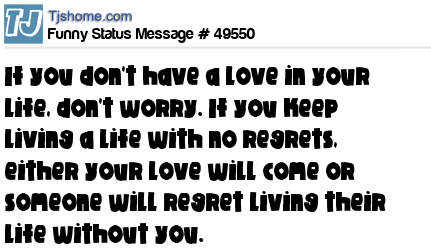 X If you don't have a love in your life, don't worry. If you keep living a life with no regrets, either your love will come or someone will regret living their life without you.