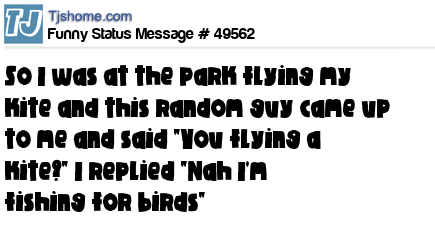 - # 197039 I was at the park flying my kite and this guy came up to me and said "You flying a kite?" I replied "Nah I'm fishing for birds"