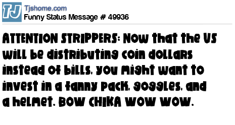 X is ATTENTION STRIPPERS: Now that the US will be distributing coin dollars instead of bills, you might want to invest in a fanny pack, goggles, and a helmet. BOW CHIKA WOW WOW.