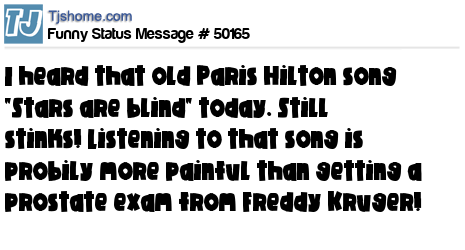 X I heard that old Paris Hilton song "Stars are blind" today. Still stinks! Listening to that song is probily more painful than getting a prostate exam from Freddy Kruger!