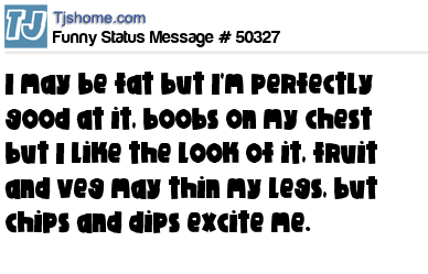 X i may be fat but I'm perfectly good at it, boobs on my chest but I like the look of it, fruit and veg may thin my legs, but chips and dips excite me.