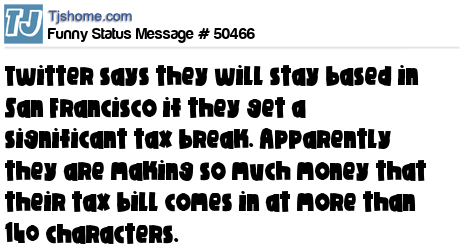 X says Twitter says they will stay based in San Francisco if they get a significant tax break. Apparently they are making so much money that their tax bill comes in at more than 140 characters.