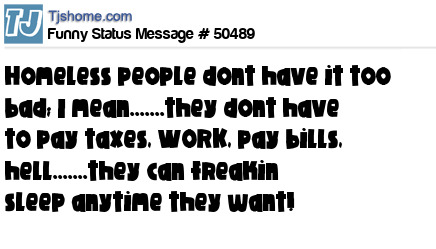 X says Homeless people dont have it too bad; I mean.......they dont have to pay taxes, WORK, pay bills, hell.......they can freakin sleep anytime they want!