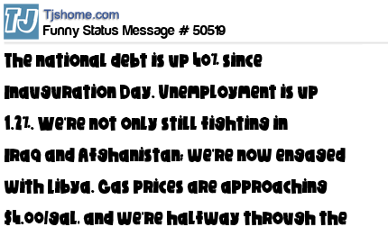 X is The national debt is up 40% since Inauguration Day. Unemployment is up 1.2%. We're not only still fighting in Iraq and Afghanistan; we're now engaged with Libya. Gas prices are approaching $4.00/gal, and we're halfway through the fiscal year and sti