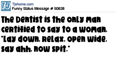 - # 50301 The Dentist is the only certified man to say to a woman: lay down, relax, open mouth, say ahh, and spit.