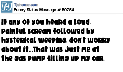 - # 105700 If you hear a loud scream followed by crying, don't worry about it...That was just me at the gas pump filling up my car.