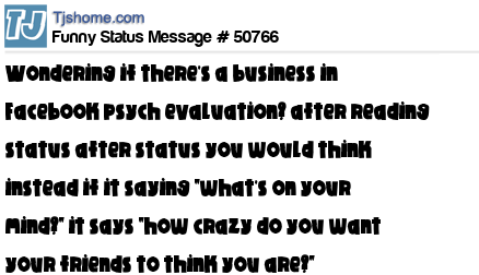 X wondering if there's a business in Facebook psych evaluation? after reading status after status you would think instead if it saying "what's on your mind?" it says "how crazy do you want your friends to think you are?"