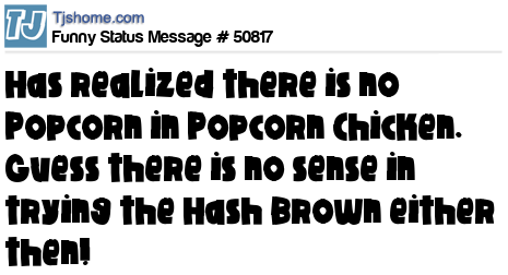 - # 7632 just found out there is no popcorn in popcorn chicken!!!!! I guess there is no point in eating HASH browns is there?