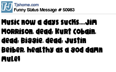 X is Music now a days sucks....Jim Morrison, dead; Kurt Cobain, dead; Biggie, dead; Justin Beiber, healthy as a god damn mule!