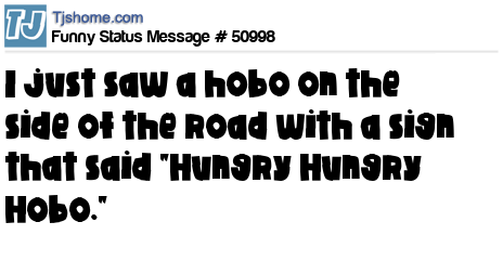 X I just saw a hobo on the side of the road with a sign that said "Hungry Hungry Hobo."