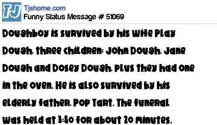 - # 45105 Doughboy is survived by his wife Play Dough, three children: John Dough, Jane Dough and Dosey Dough, plus they had one in the oven. He is also survived by his elderly father, Pop Tart. The funeral was held at 3:50 for about 20 minutes.